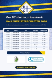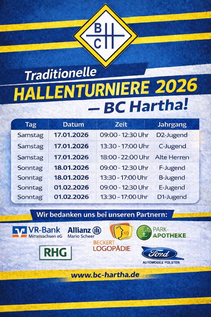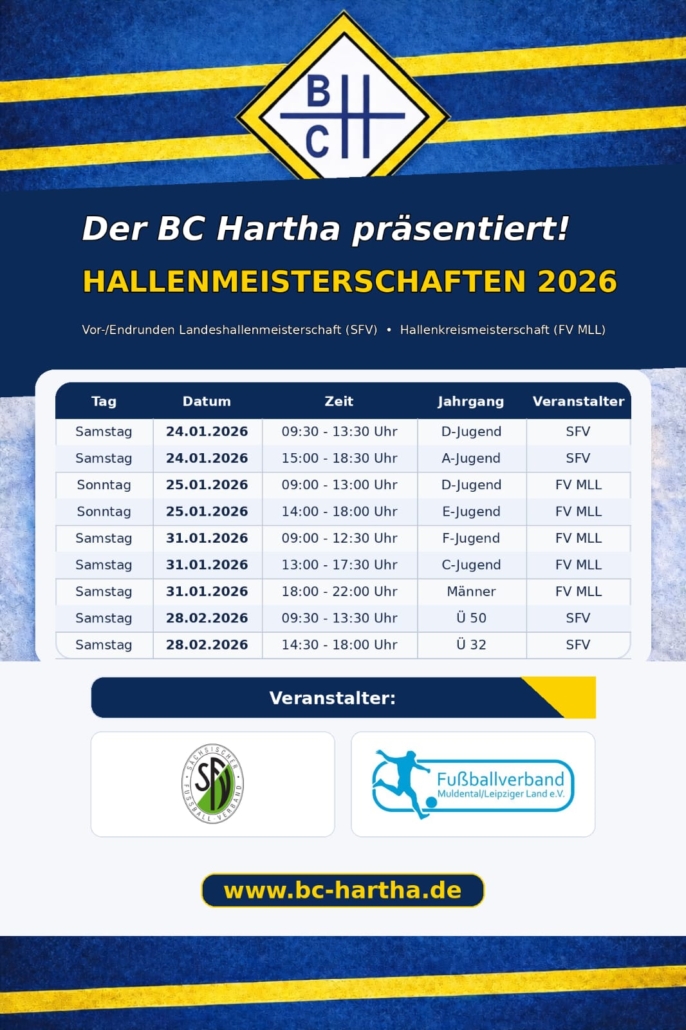 Im Januar 2026 steht in Hartha wieder alles im Zeichen des Hallenfußballs. Der BC Hartha richtet auch in diesem Winter seine traditionellen Hallenturniere in den Altersklassen F-, E-, D-, C- und B-Jugend aus und freut sich darauf, zahlreiche Mannschaften sowie fußballbegeisterte Zuschauerinnen und Zuschauer in der Hartharena begrüßen zu dürfen.